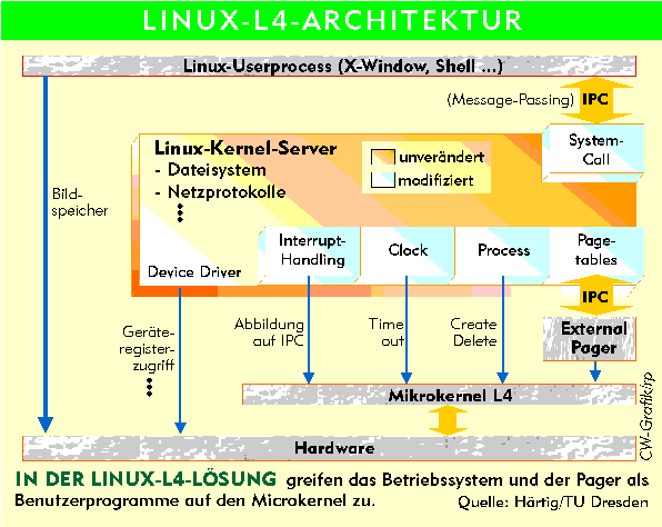 Unveränderte und modifizierte Bereiche des Linux-Kerns werden von Härtig unter dem neuen Begriff "Linux-Kernel-Server" zusammengefaßt. Prinzipiell ließe sich ein vergleichbarer Server auch für andere Betriebssysteme schaffen, heißt es bei den Wissenschaftlern. Vollständig aus dem Linux-Kern ausgelagert wurde die Hauptspeicherverwaltung (externe Pager), die sich im Modell der Dresdener zwischen dem Server und dem Mikrokernel L4 befindet. Entscheidend bei dieser Konstellation ist, daß weder Server noch Pager im Hardware-Kernel-Mode als Betriebssystem laufen, also direkt auf die Hardware zugreifen, sondern als Benutzerprogramme (User-Level) auf den Mikrokernel zugreifen.
